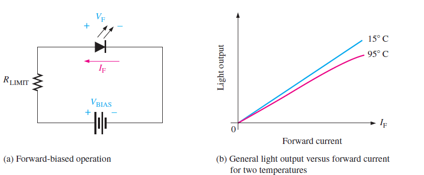 Following Figure illustrates how an adequate forward current causes the LED to emit light. As shown in Figure below, the quantity of power output converted into light is exactly proportional to the forward current. The amount of light produced increases proportionally to an increase in IF. Temperature has an impact on both the color and intensity of the light emission. As shown in the graph, light intensity decreases as temperature rises.