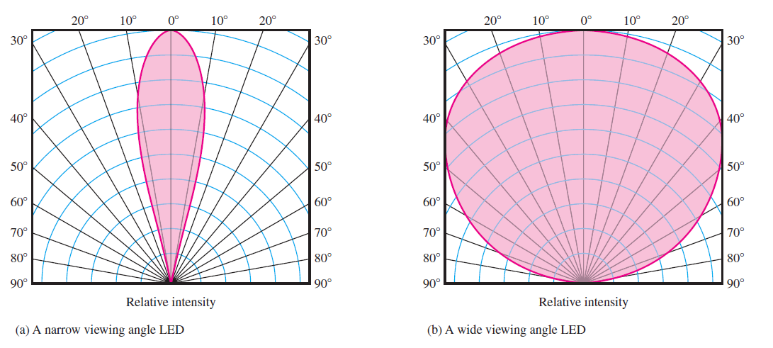 For some applications, like traffic lights, where the light is only meant to be seen by specific cars, directional patterns can be advantageous. The pattern for a forward-directed LED, like those found in tiny panel indicators, is depicted in figure part (a). The pattern with a broader viewing angle, like those found in many super-bright LEDs, is depicted in figure part(b).