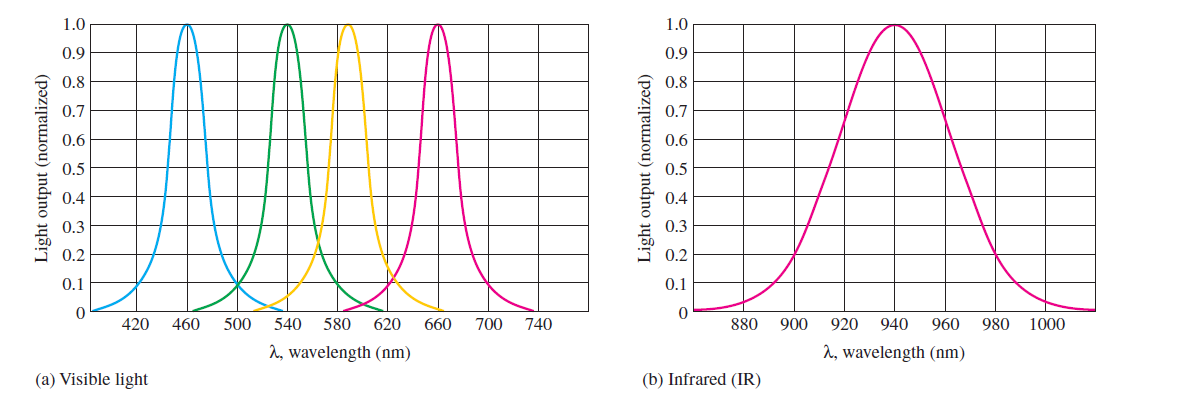 The spectral output curves are shown that an LED emits light over a specific range of wavelengths. The curve in part (b) is for a typical infrared LED, and the curve in part (a) is the light output vs wavelength for common visible LEDs.